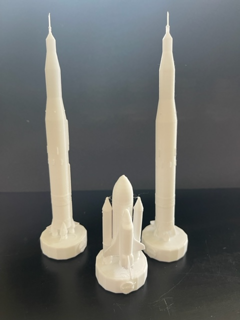 I have been diligently working on improving my 3D printing skills. I have also been asked to help at the 3D printing lab at my high school - I maintain the printers, help students with their projects, install new printers, decommission old ones, and try to troubleshoot machines that are acting up. Now that I am much better at design and controlling the print parameters, I decided to fabricate a chess set from poly actic acid (PLA) where each piece is a NASA spacecraft. Below is three pieces successfully printed from the set.